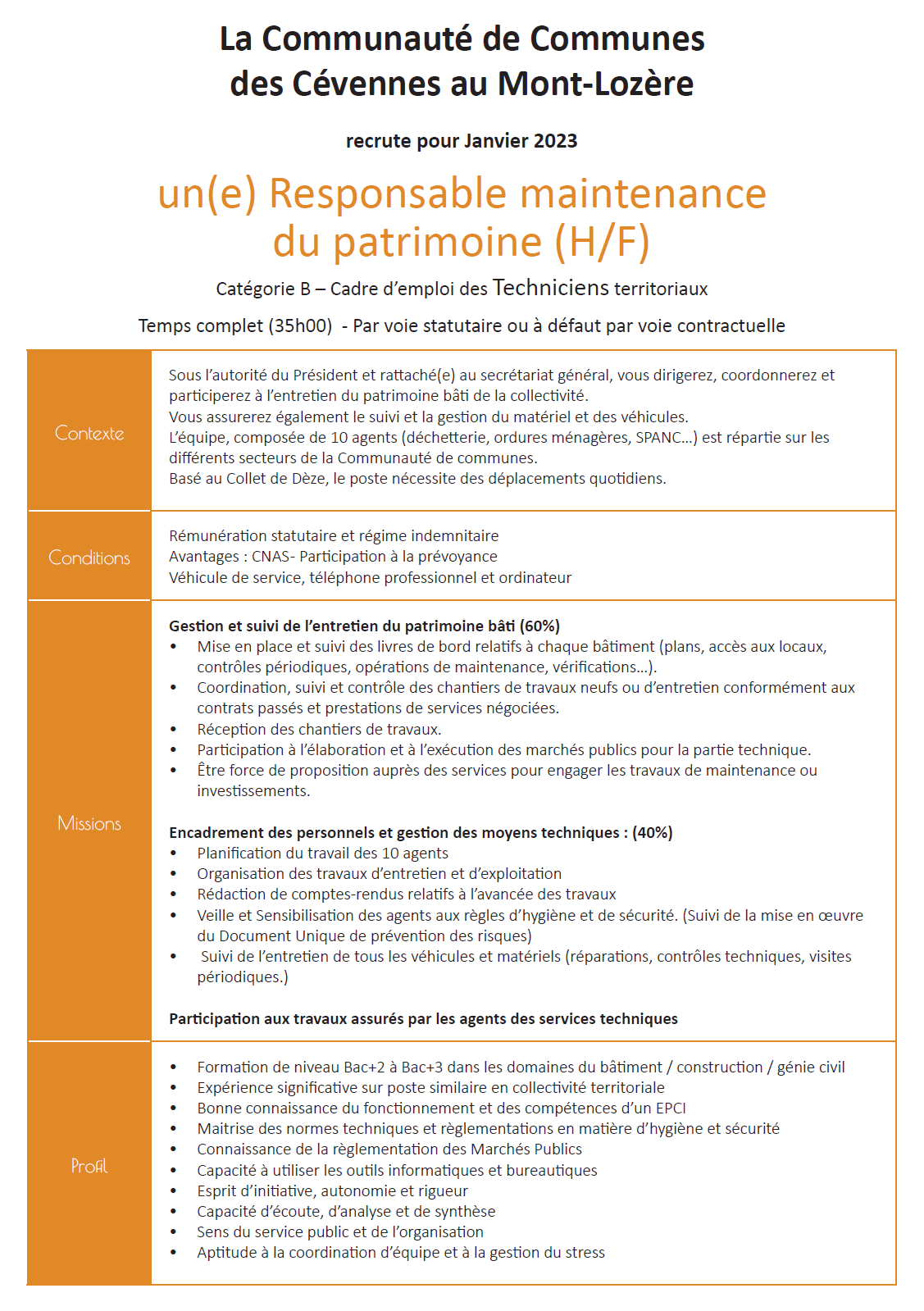 La communauté de communes Des Cévennes au Mont Lozère recrute un(e) Responsable maintenance du patrimoine (H/F)